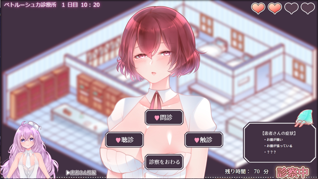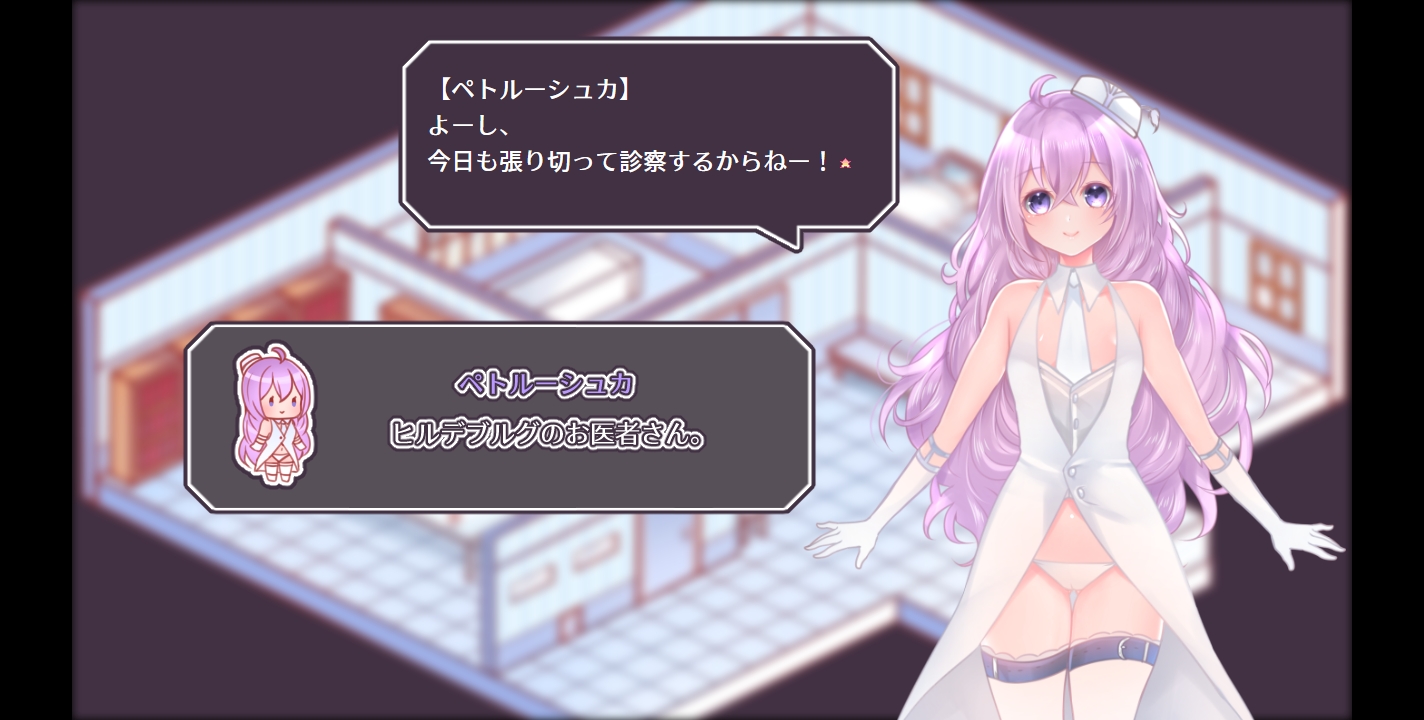 可愛い医者と可愛い触手モンスターを操作し、病院にやってきた女の娘たちを診察・治療するほのぼのシミュレーションミニゲーム。