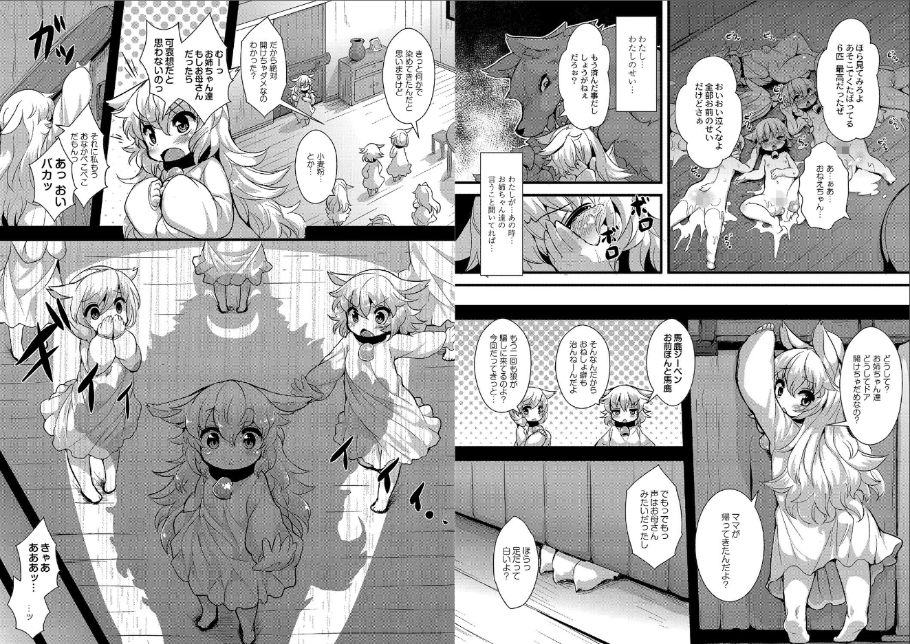上記プレイの他、ジーベンちゃんや姉妹がおおかみを逆レイプする描写(各1カット)のみあり。