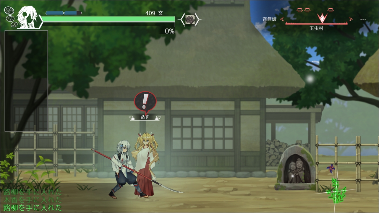 マップ上で拾えるのアイテム(よもぎなど)を拾い調合することで回復アイテムやストーリーを進行するのに必要なアイテムを作成することができます。