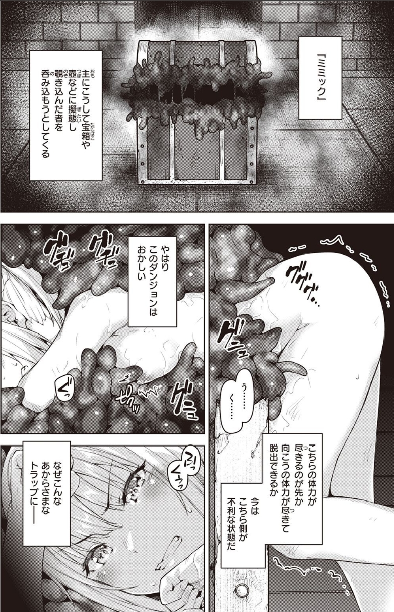 • ミミックに引っ掛かり立ちバック(上半身は宝箱の中、下半身は宝箱の外に出ている状態)で拘束。その状態で乳首を責められ絶頂。絶頂後全身を丸呑みされかけるも女冒険者(イサナ)に両足を引っ張られミミックから脱出する。脱出時ミミックの体内に全身を愛撫された影響で絶頂潮吹きする描写あり