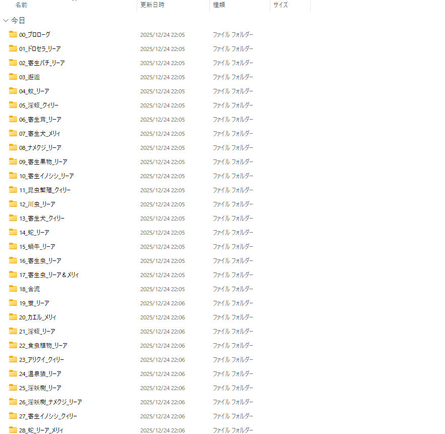 今作も前回同様下記のようなフォルダ構成で描かれます。プロローグに当たる部分は足を滑らせリーアちゃんとメリィちゃんが分かれるまでですね。