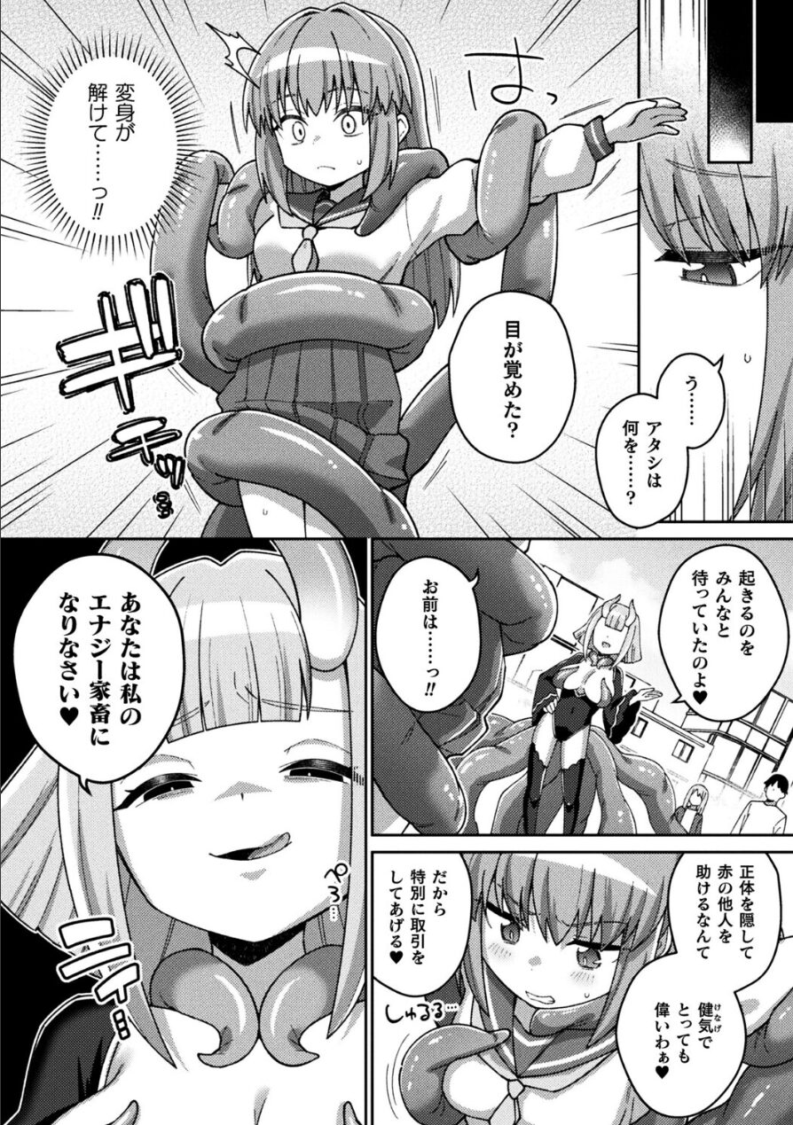 - 攻撃が効かず逆に触手に攻撃され気絶。目が覚めると変身が解けて触手に十字架に張り付けられたような形で拘束されていて…